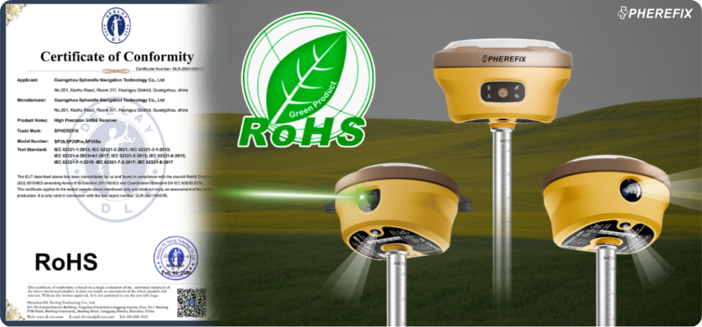 La certificazione RoHS (Restriction of Hazardous Substances) conferma che i prodotti Spherefix sono conformi ai rigorosi standard internazionali che limitano l'uso di materiali pericolosi come piombo, mercurio, cadmio e altre sostanze soggette a restrizioni. Questa certificazione si applica a tutti i prodotti Spherefix, compresi i ricevitori GNSS RTK, le stazioni CORS, lo SLAM LiDar Scanner, i veicoli di superficie senza equipaggio (USV) e le attrezzature per l'agricoltura di precisione.