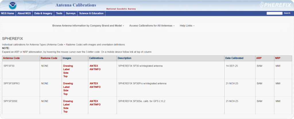 Guangzhou, 2 Nov 2025 – Spherefix confirms that its SP30, SP30SE and SP30Pro GNSS receivers have passed the U.S. National Geodetic Survey (NGS) antenna calibration. The listing allows the entire family to be used on federal, state and private jobs throughout North America, Oceania and Latin America where NGS phase-center values are mandatory.